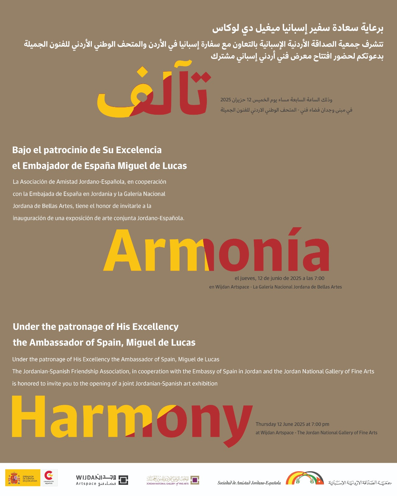 Under the Patronage of His Excellency the Ambassador of Spain, Miguel de Lucas, The Jordanian Spanish Friendship Association, in Cooperation with the Embassy of Spain in Jordan and The Jordan National Gallery of fine Arts is Honored to invite you to the opening of a Joint Jordanian- Spanish art exhibition at Wijdan Artspace – The Jordan National Gallery of Fine Arts.